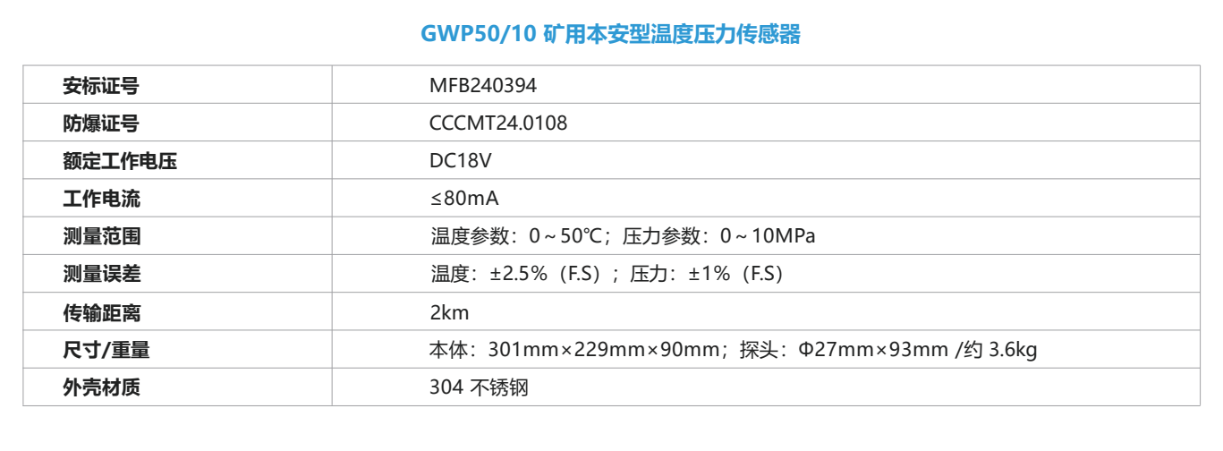 GWP50/10 礦用本安型溫度壓力傳感器適用于有瓦斯和煤塵爆炸危險(xiǎn)的礦井下,是水文監(jiān)測系統(tǒng)的傳感器部分,可作為礦用水文監(jiān)測點(diǎn)的水溫及水壓感知采集器。 ?